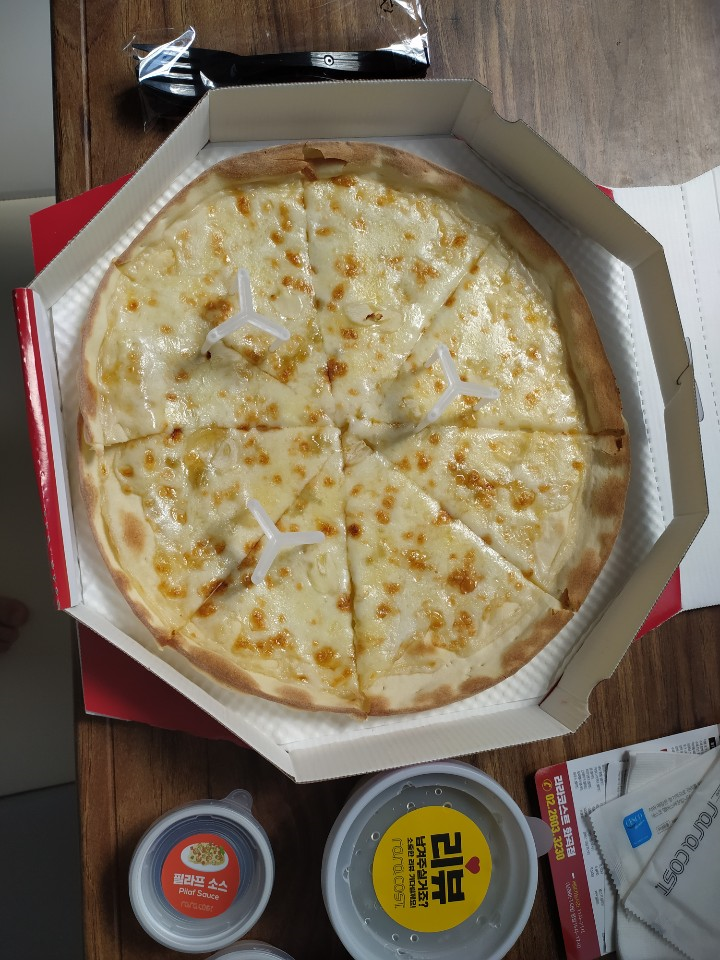 미취학 자녀 둘과 나, 셋이 먹고 고르곤졸라 피자 세 조각 정도가 남았다.