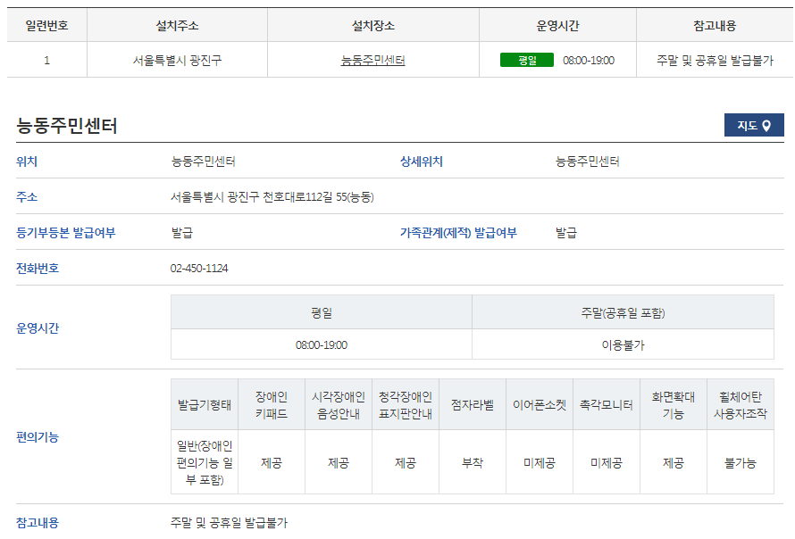 편의기능은 각 무인민원발급기마다 다르니 확인이 필요하며, 운영시간도 상이하니 꼭 확인이 필요하다.