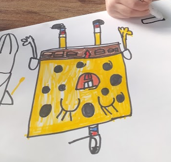 안보고도 그릴 정도로 스폰지밥 캐릭터를 좋아하는데, 나중에 머리 위에 그린 것은 뭐냐고 물어보니 햄버거 만들때(스폰지밥의 직업은 집게리아 버거집에서 햄버거를 만드는 일이다) 쓰는 모자라더니, 정말 모자를 쓰고 일하는구나 ㅎ