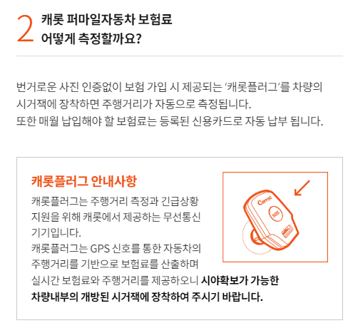 주행거리에 따라 보험료를 후불로 낼 수 있는 ‘퍼마일 자동차보험’의 경우 자동차의 시거잭에 캐롯 플러그(운행정보 수집장치)를 꽂아 주행거리를 측정하며, 기존 다이렉트 자동차보험보다 8%에서 30% 저렴하게 책정되었습니다.