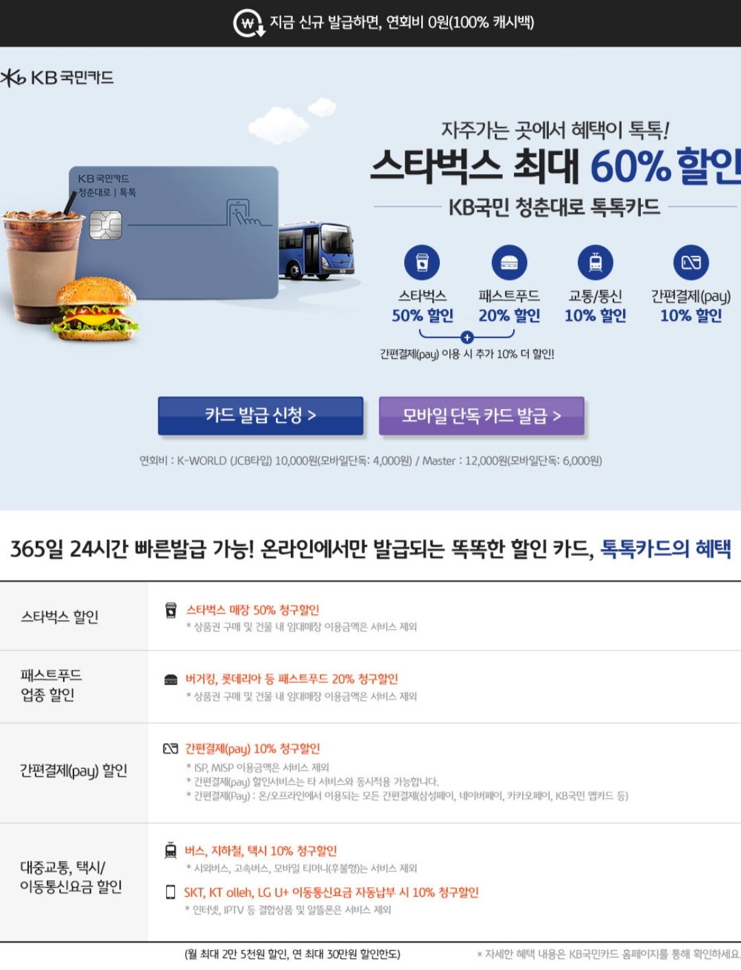 KB 국민카드 청춘대로 톡톡카드를 이용하면 50%할인에 간편결제 이용 시 추가 10% 할인되니 참고하세요~