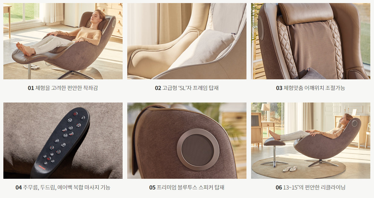 인테리어까지 고려한 고급스러운 디자인이네요. 파우제가 독일어로 '휴식'을 뜻한다고 하는데요. 리클라이닝 기능도 포함했네요. 기존 안마의자는 안마기능을 사용하지 않는 경우 자리를 차지하는 부담스러운 존재인데, 그런 아쉬움의 틈새를 잘 파고든 안마의자란 생각이 듭니다.