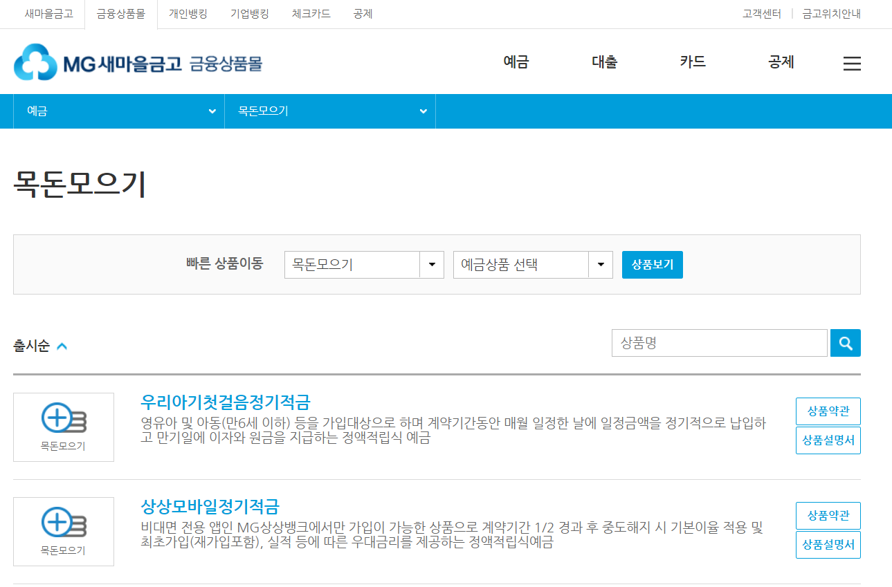 한가지 주의사항은 MG 새마을금고 상품의 경우 각 새마을금고마다 취급하는 상품이 다릅니다. 반드시 해당 금고에 상품취급 여부를 사전에 문의하고 가입해야 하며, 똑같은 상품이어도 금고마다 만기 및 이율이 다를 수 있으니, 각 금고를 통해 확인이 필요합니다.