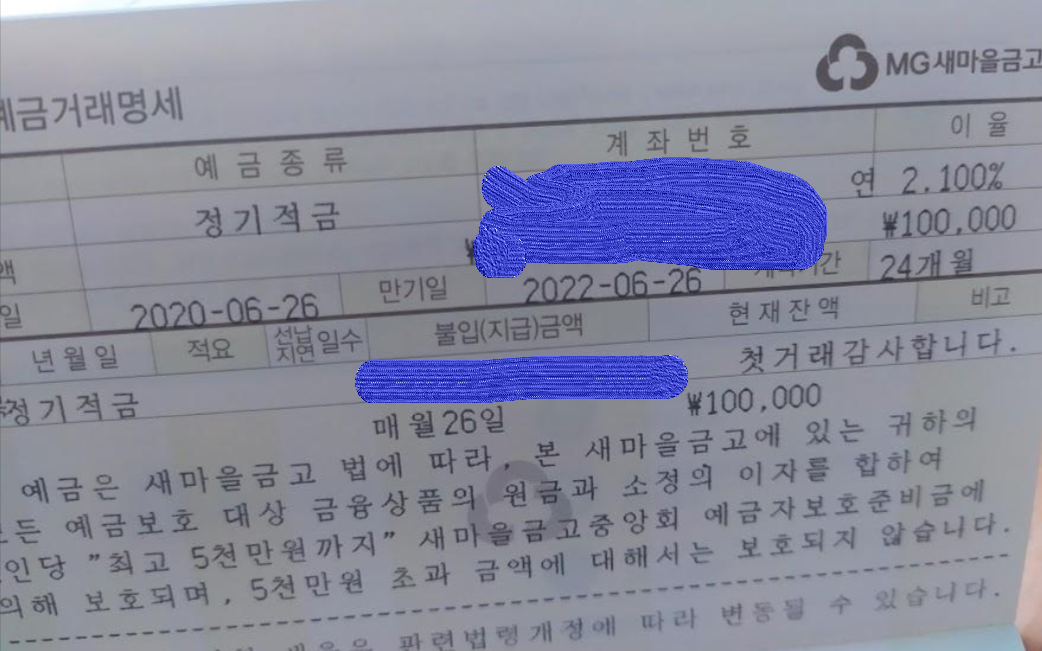 그래서 월 불입 금액이 큰 금액은 아니지만, 2금융권중 유일하게 전국 모든 지자체에 지점을 갖고 있는 MG새마을금고에서 정기적금 통장을 새로 만들고 가입했는데요. MG새마을금고에서는 처음 적금을 드는지라, 동네 MG새마을금고에 방문해서 진행했습니다.