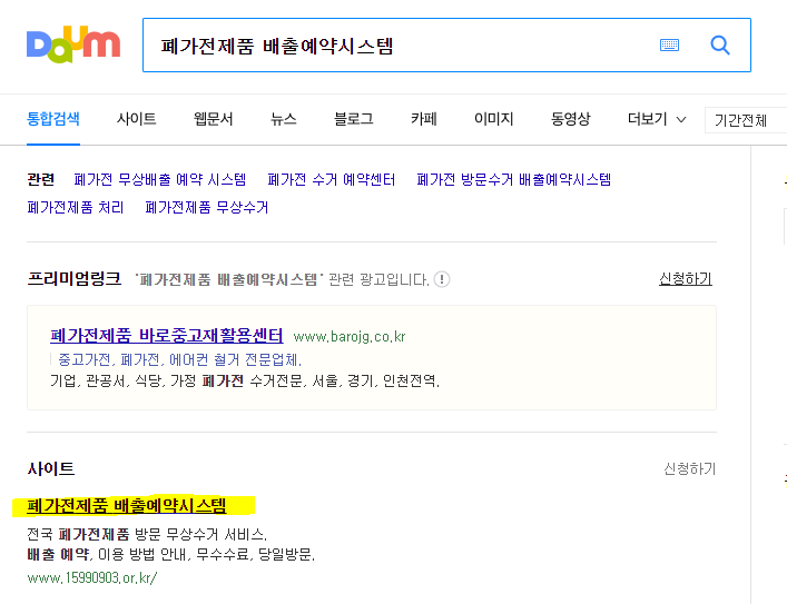 홈페이지를 통해서 사전 예약을 받는데요. 포털 사이트에서 아래와 같이 '폐가전제품 배출예약시스템' 혹은 '폐가전제품 무상수거' 등으로 검색하면 아래와 같이 '폐가전제품 배출예약시스템' 홈페이지가 검색됩니다.
