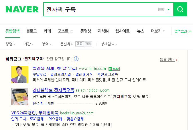 포털에서 '전자책 구독'을 입력하면 세 개 정도 눈에 띄는 구독 서비스 사이트가 뜹니다.