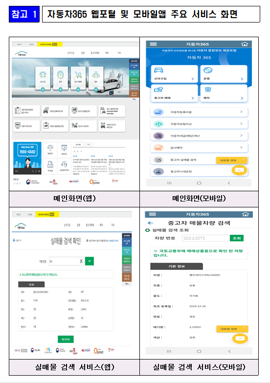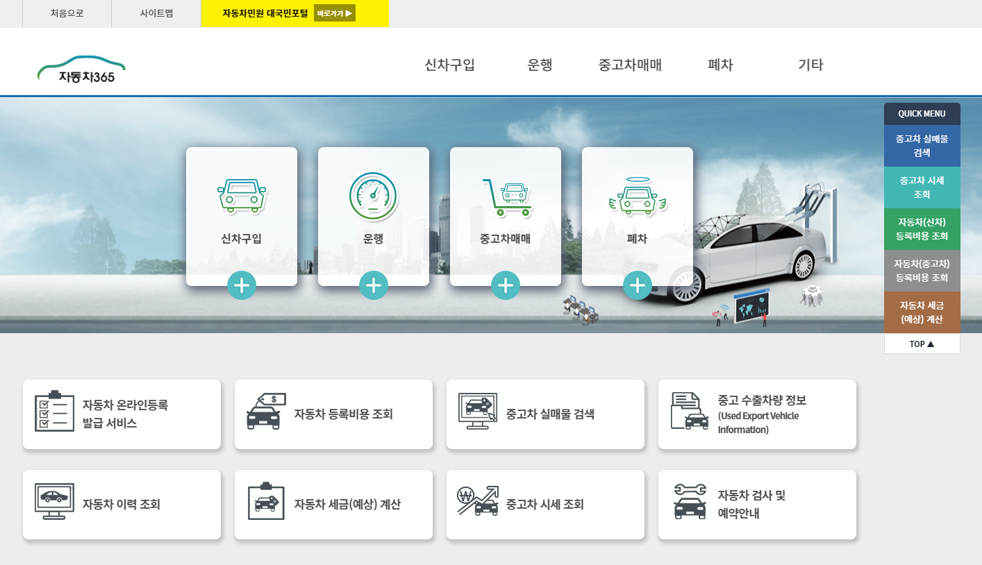 자동차 365는 국토부가 운영하는 온라인 사이트입니다. 이 사이트에서는 차량 구입 ~ 운행, 중고차 매매, 정비 및 검사, 폐차까지 다양한 정보를 제공하고 있는데, 물론 모바일 어플리케이션을 통한 이용도 가능합니다.
