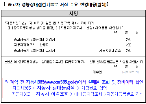 중고차를 구입할 때 소비자가 중고차 성능상태 점검기록부 서식 내에 정비 이력 확인과 실매물 검색 방법 등을 표기하는 자동차 관리법 시행규칙 개정안을 13일부터 입법 예고한다고 국토교통부가 발표했습니다.
