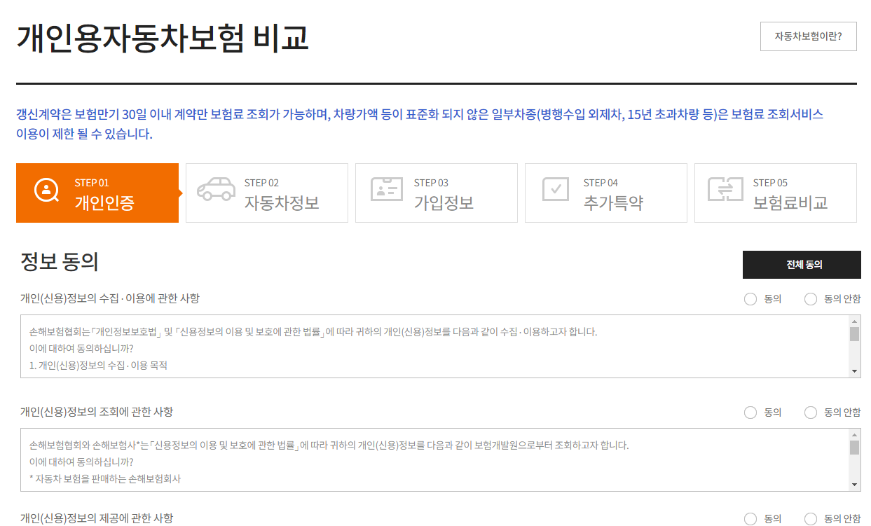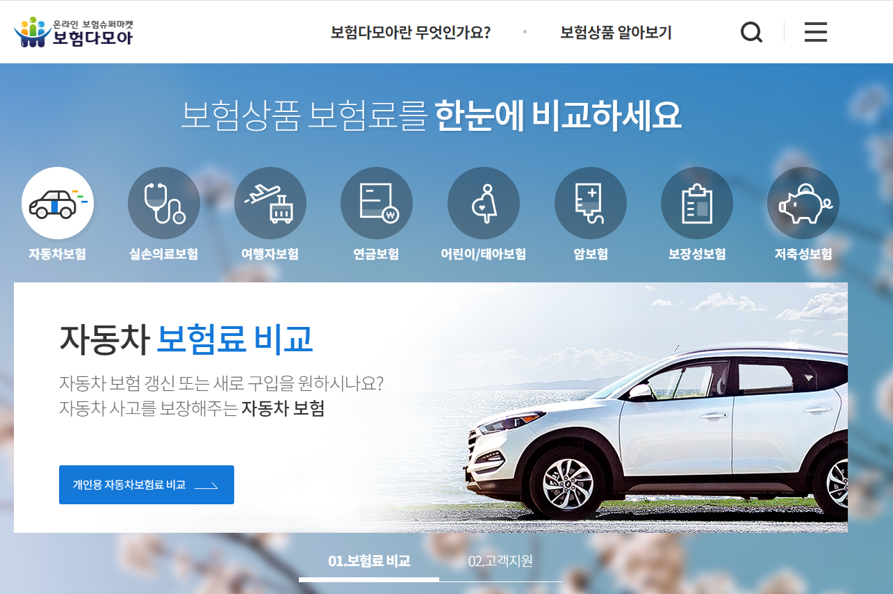보험다모아 홈페이지에서 [자동차 보험료 비교]를 클릭해 정보를 입력합니다.