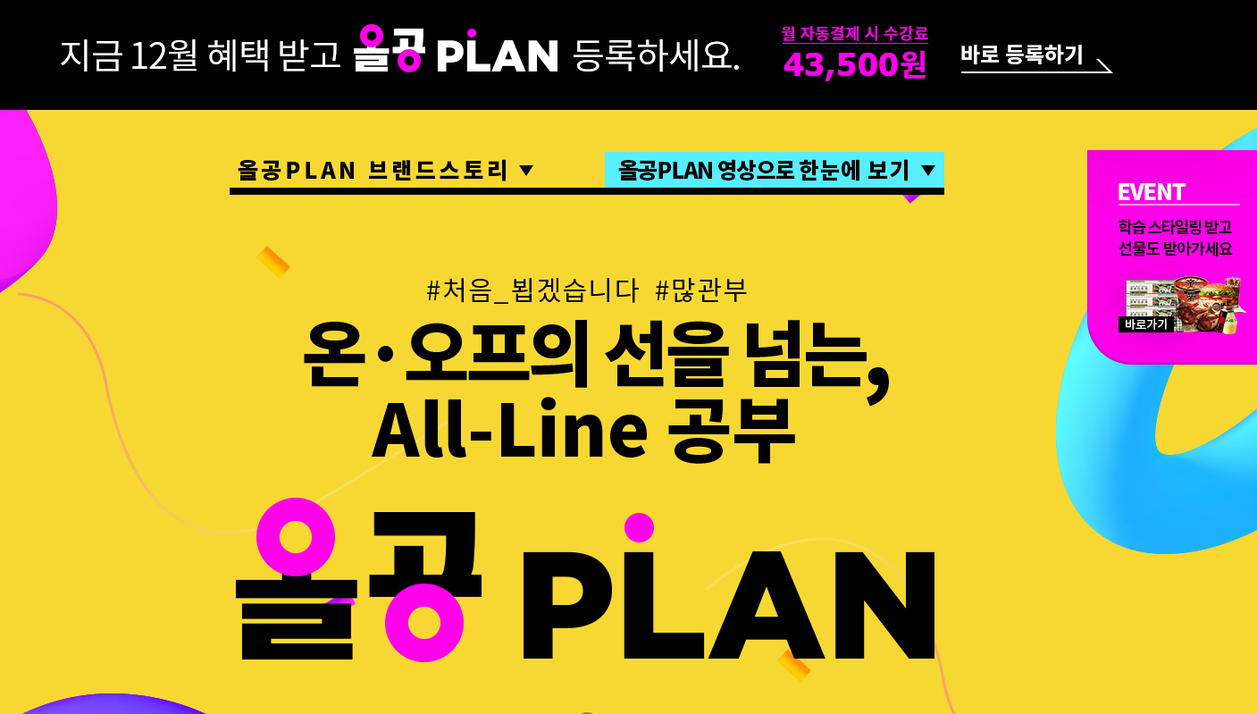 올공플랜은 오프라인 학원처럼 자신이 원할 때만 비용을 내는 ‘월 결제 방식’을 추가했습니다. 월 자동결제시 수강료가 43,500원이네요.