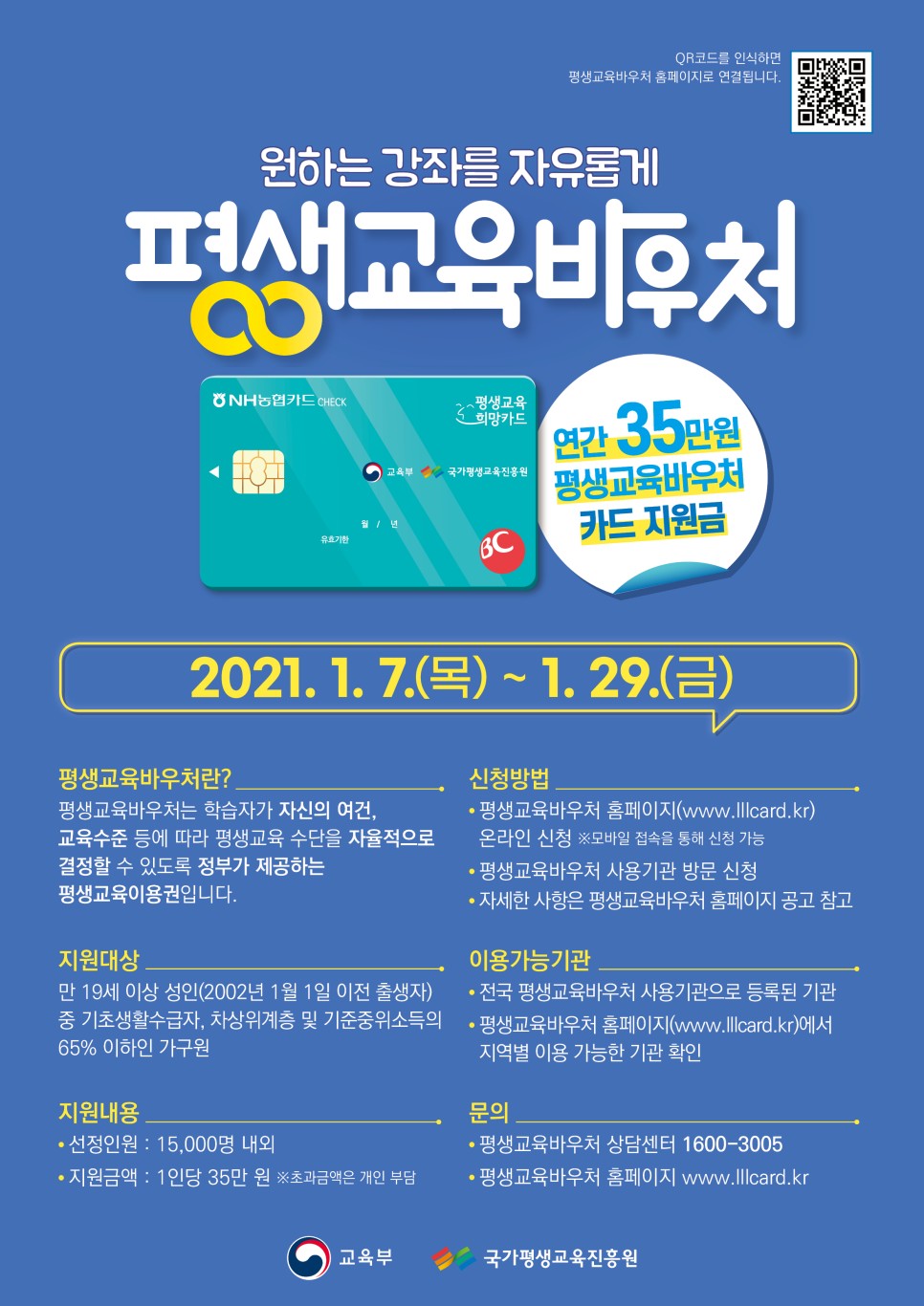 2021년 평생교육 이용권(바우처) 신청을 1월 7일(목)부터 29일(금)까지 누리집(www.평생교육바우처.kr 또는 www.lllcard.kr)을 통해 접수합니다.