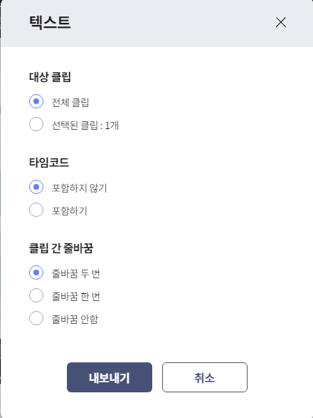 파일 형식에서 텍스트를 선택후 옵션을 선택하고 내보내기를 클릭합니다.
