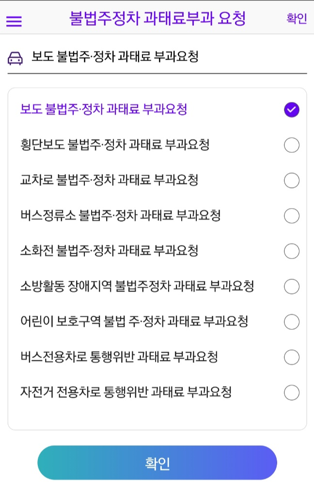 앱을 다운로드 받아 설치 후 본인인증을 거치고 나면, 불법주정차 등에 과태료부가 및 생활불편 사항에 대해 편리하게 신고할 수 있습니다.