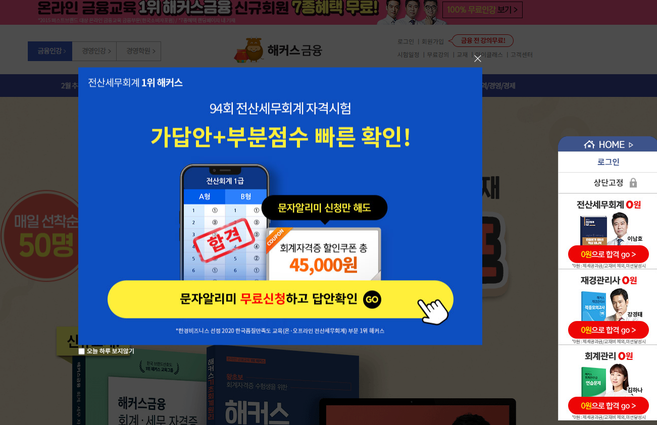 베스트셀러 1위 교재를 제공하고 수강료까지 환급해주는 <전산세무회계 수강료 0원 합격패스>를 해커스금융에서 제공합니다.