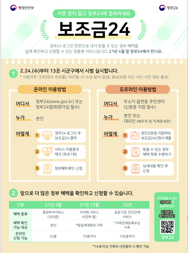 시범 서비스 시작일은 2월 24일(수)이고 4월 말까지 대구 동구, 인천 연수구, 등 총 13개 시·군·구*에서 ‘보조금24’ 시범 운영서비스를 실시하게 됩니다.