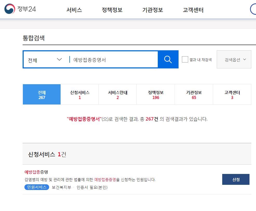 정부24 홈페이지에 접속 해 검색어를 [예방접종증명서]로 지정해 검색하면 다음과 같은 화면이 나옵니다.