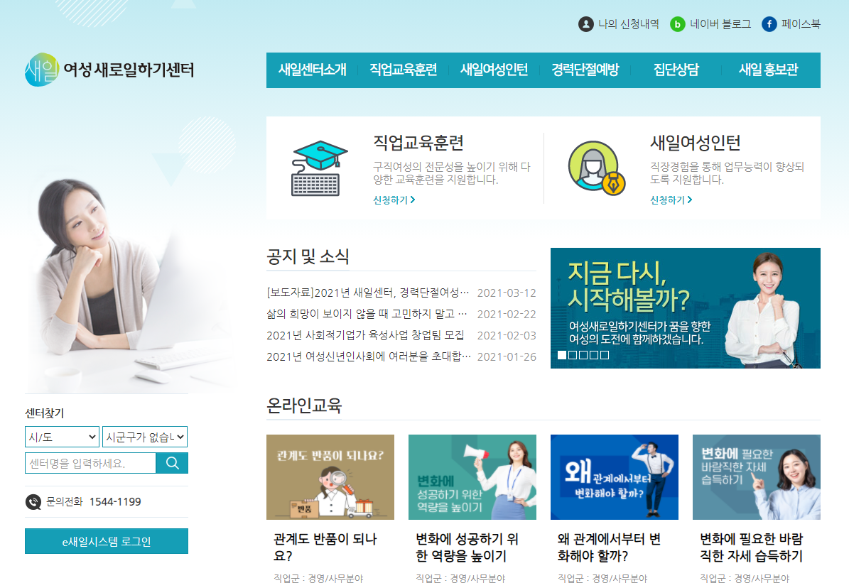 고용노동부와 여성가족부가 육아나 출산으로 경력이 단절된 여성을 위해 설립한 취업지원 전담기관인 여성새로일하기센터(saeil.mogef.go.kr/)에서는 직업교육훈련, 인턴쉽, 취업연계 등의 서비스를 제공합니다.