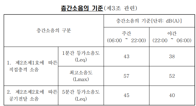 2. 위 표의 기준에도 불구하고 「주택법」 제2조제2호에 따른 공동주택으로서 「건 축법」 제11조에 따라 건축허가를 받은 공동주택과 2005년 6월 30일 이전에 「주택법」 제16조에 따라 사업승인을 받은 공동주택의 직접충격 소음 기준에 대 해서는 위 표 제1호에 따른 기준에 5dB(A)을 더한 값을 적용한다.